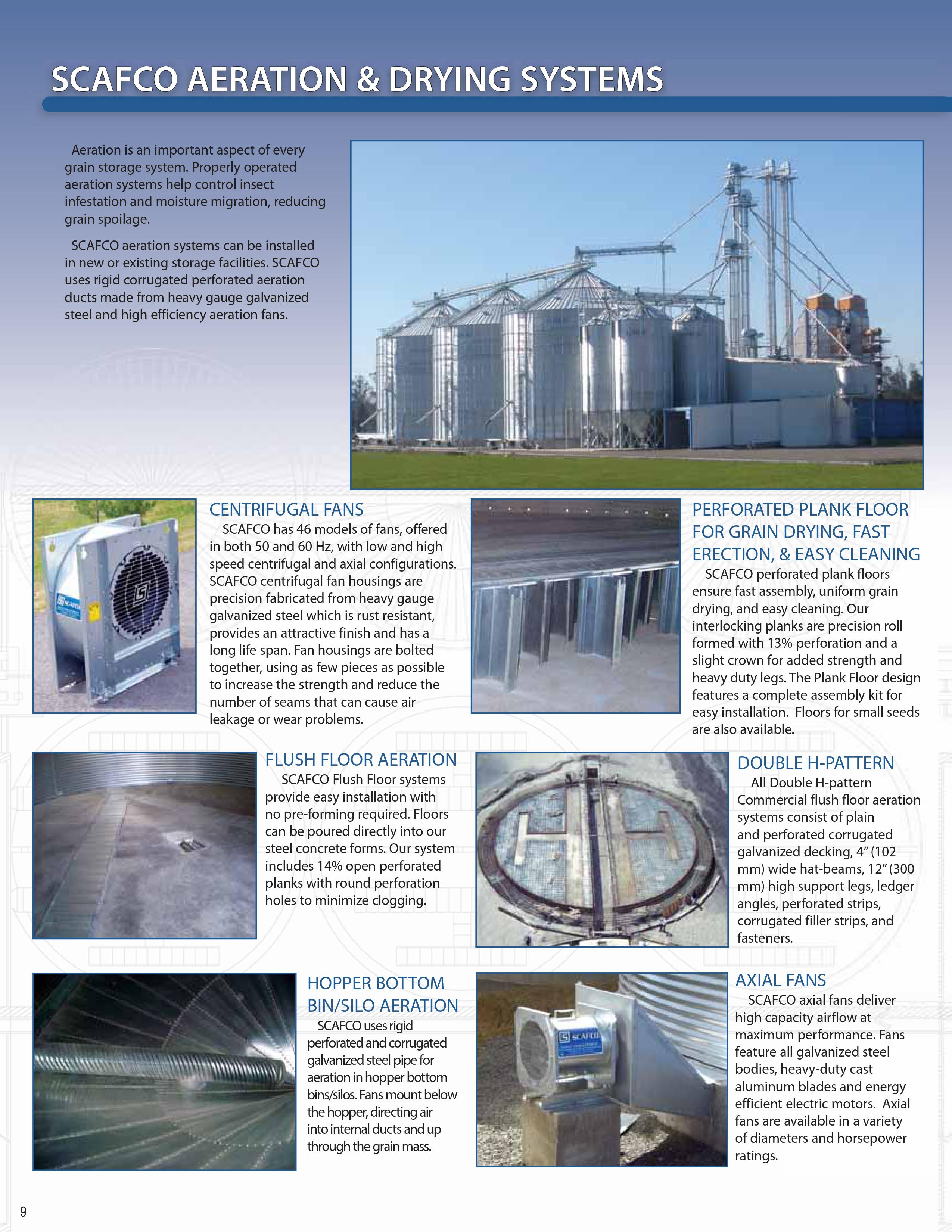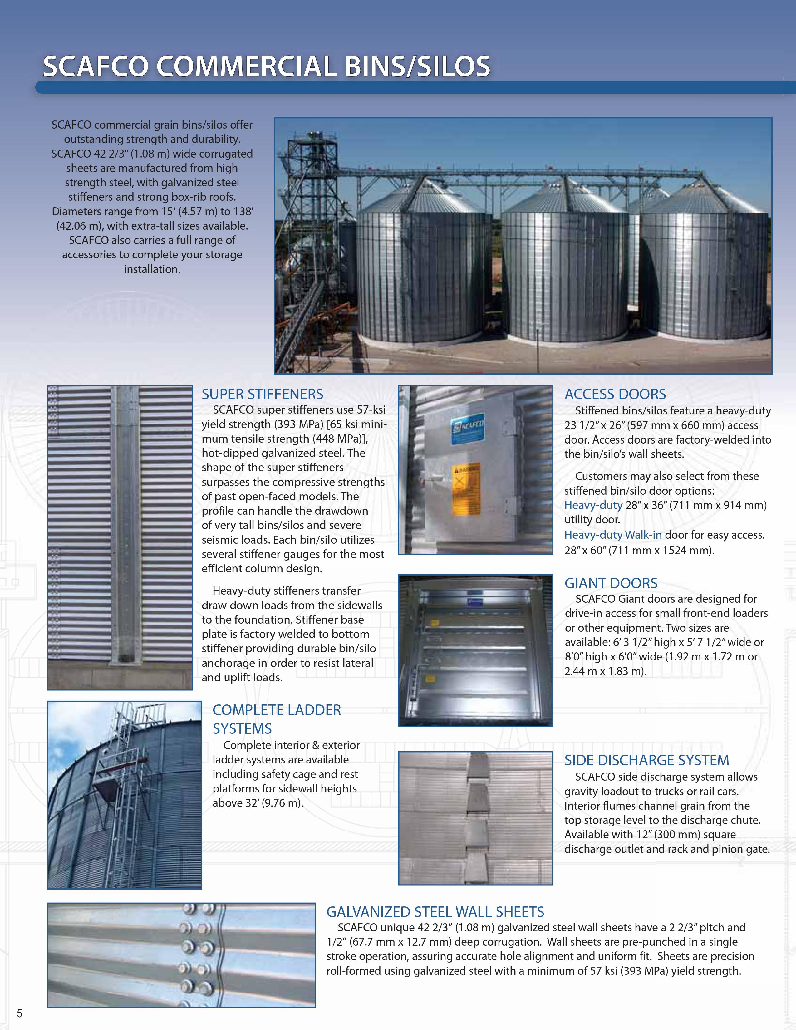SCAFCO商用穀物箱具有出色的強度和耐用性。所有屋頂,牆板和扶強材均採用G115塗層鋼(最小350gr / m 2鋅)製造。SCAFCO 42“(1.08 m)寬波紋板由高強度鋼製成,鍍鋅鋼加強筋和堅固的箱形肋板屋頂。直徑範圍從15’到138’(4.57m到42.06 m)。SCAFCO還生產物料搬運設備,以完成您的糧食儲存項目。